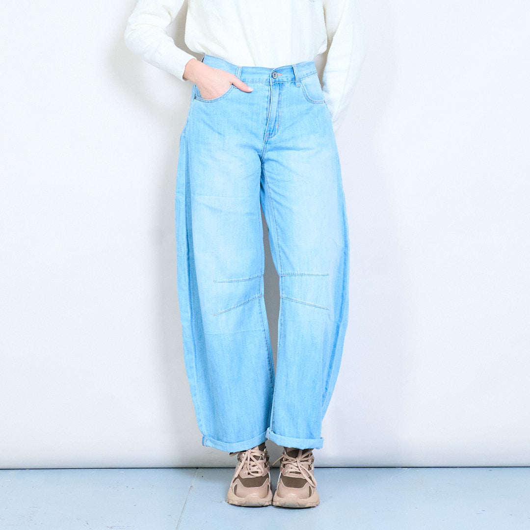 结构化膝盖面板宽松锥形浅色水洗牛仔裤批发