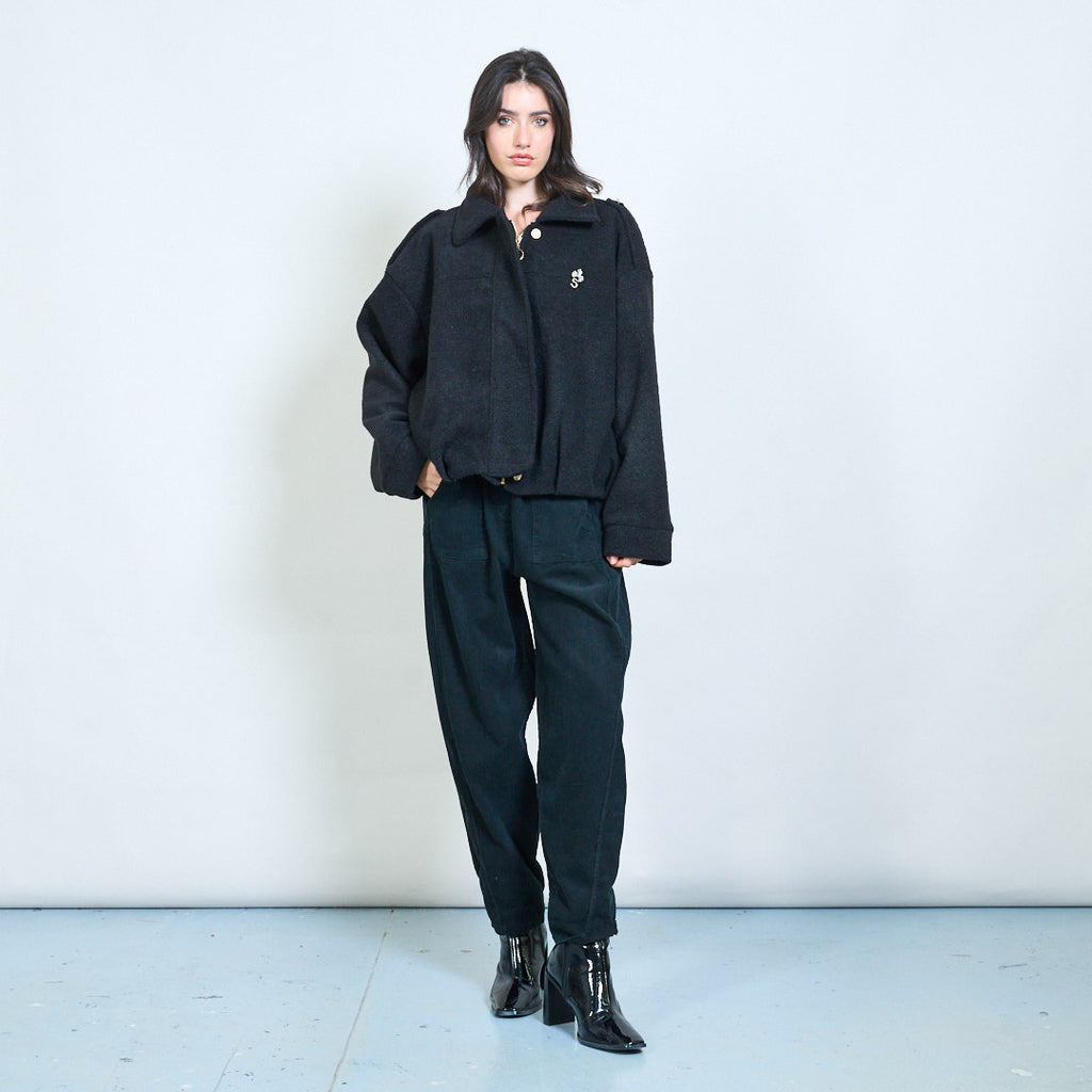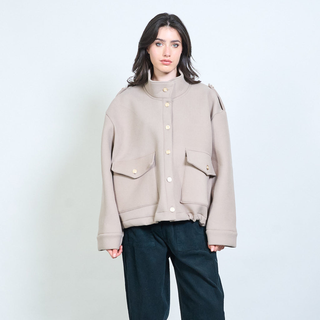 带有拉链闭合批发的军事启发的裁剪羊毛效应夹克
