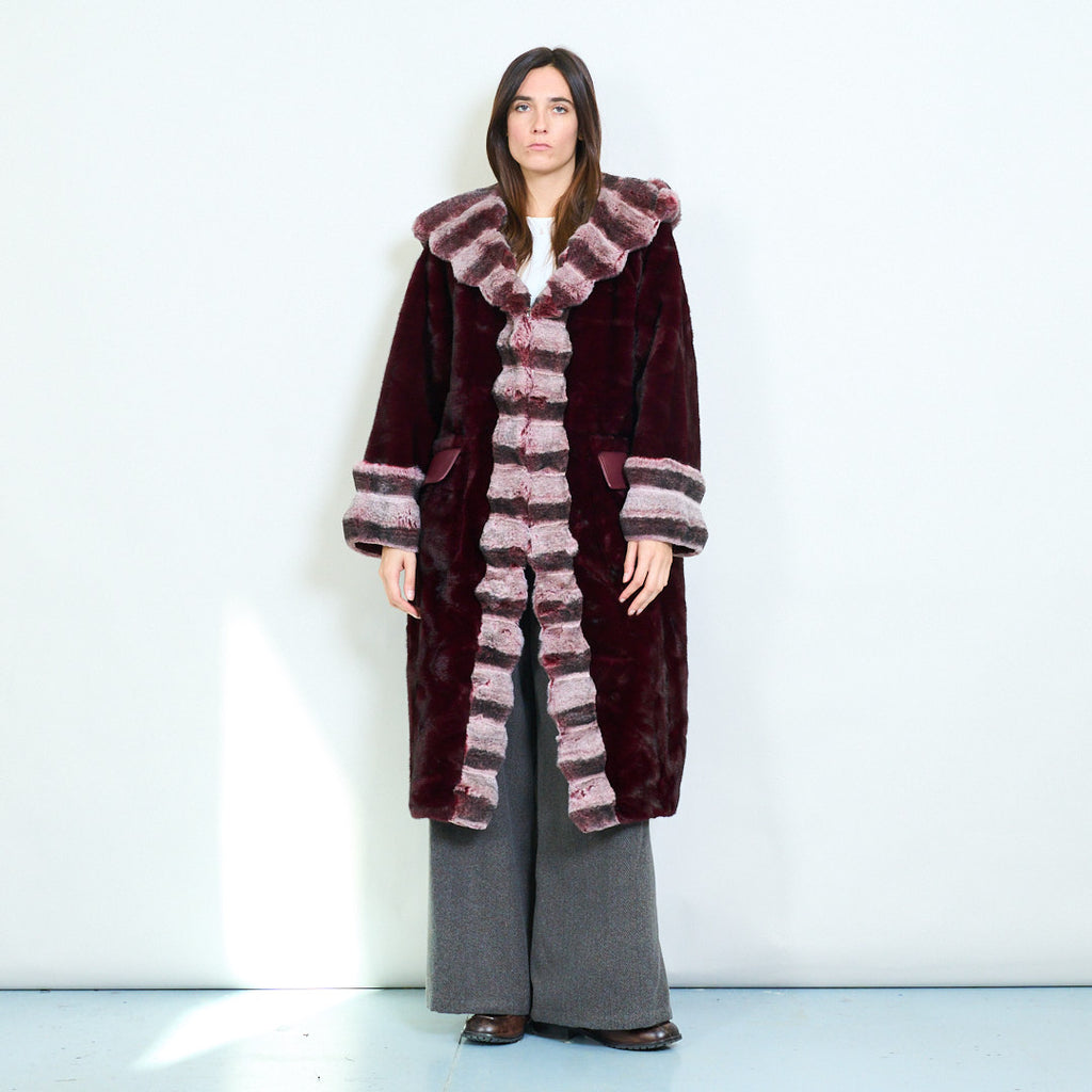 Luxurious longline patterned trim faux fur coat wholesale