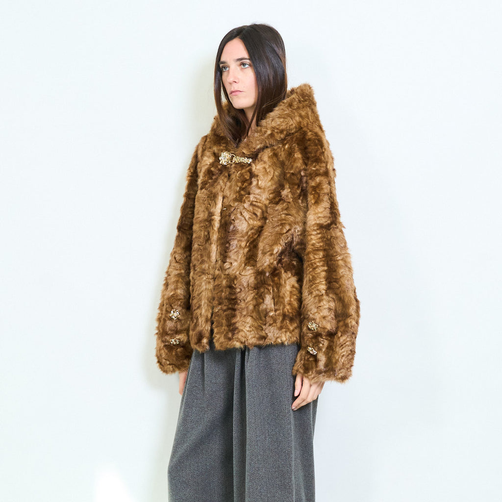 Cropped textured faux fur coat with jeweled clasp and sleeve details wholesale