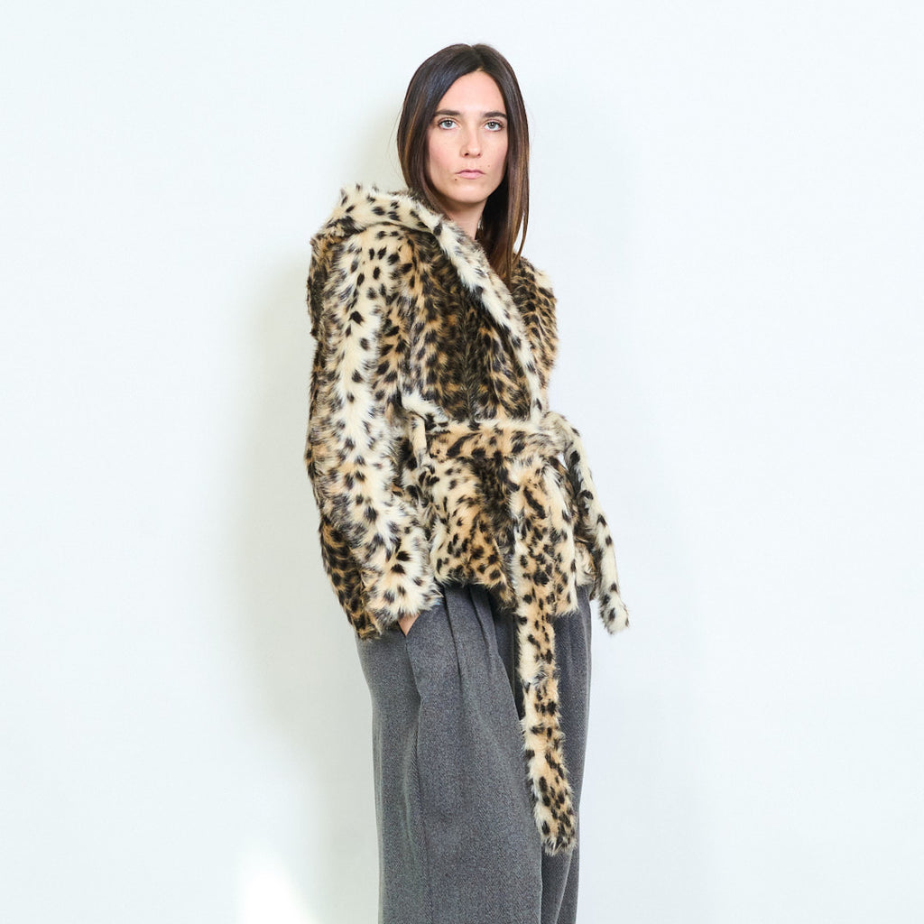 Leopard print faux fur belted hooded coat wholesale