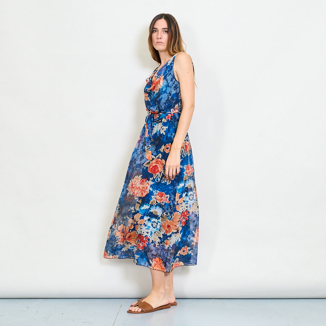 复古花朵卷颈腰带长裙批发