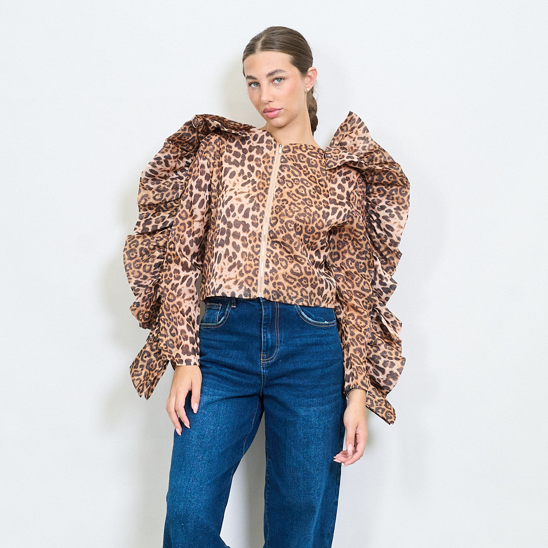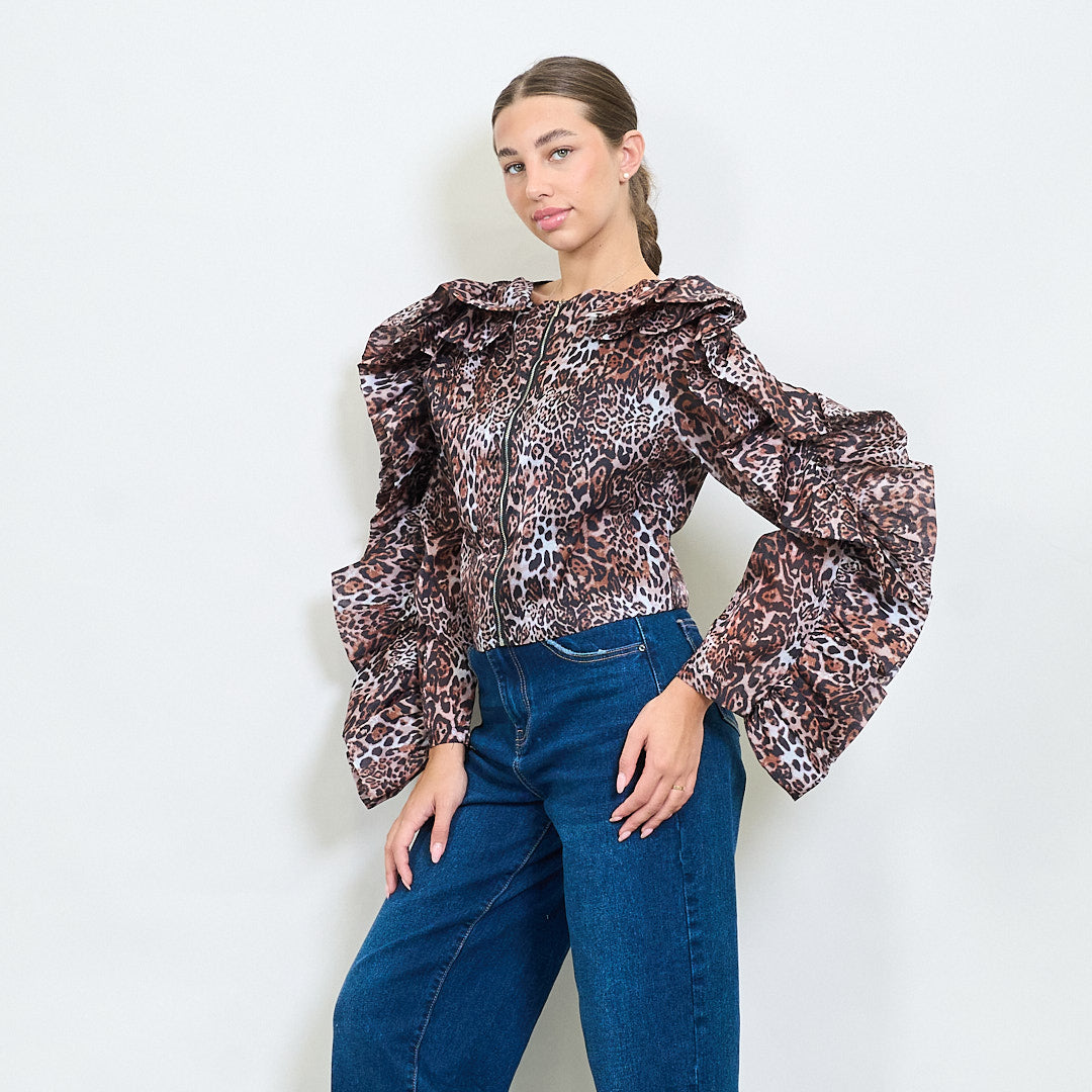 缎面豹纹衬衫,夸张的分层荷叶边袖子批发
