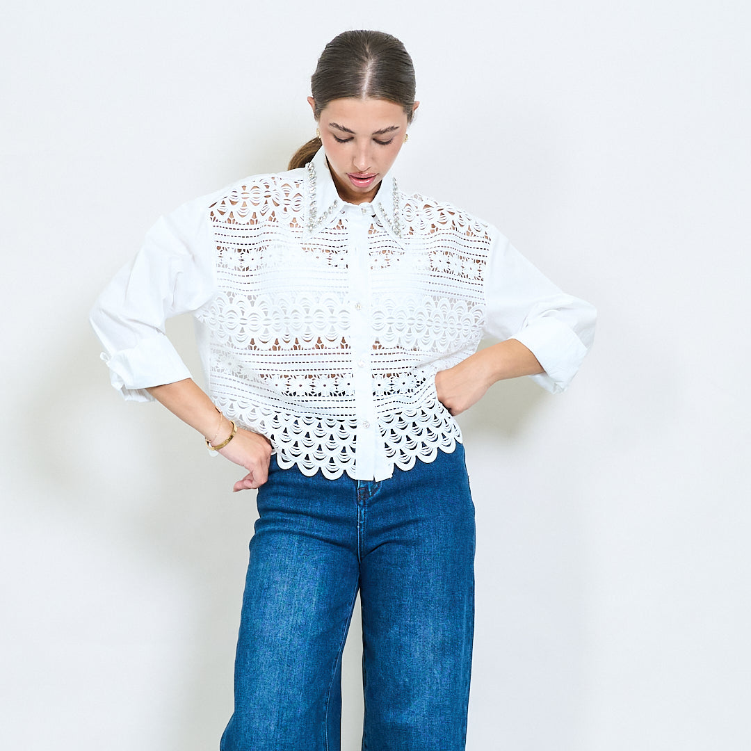 水晶装饰的衣领衬衫,带有扇形蕾丝前批发