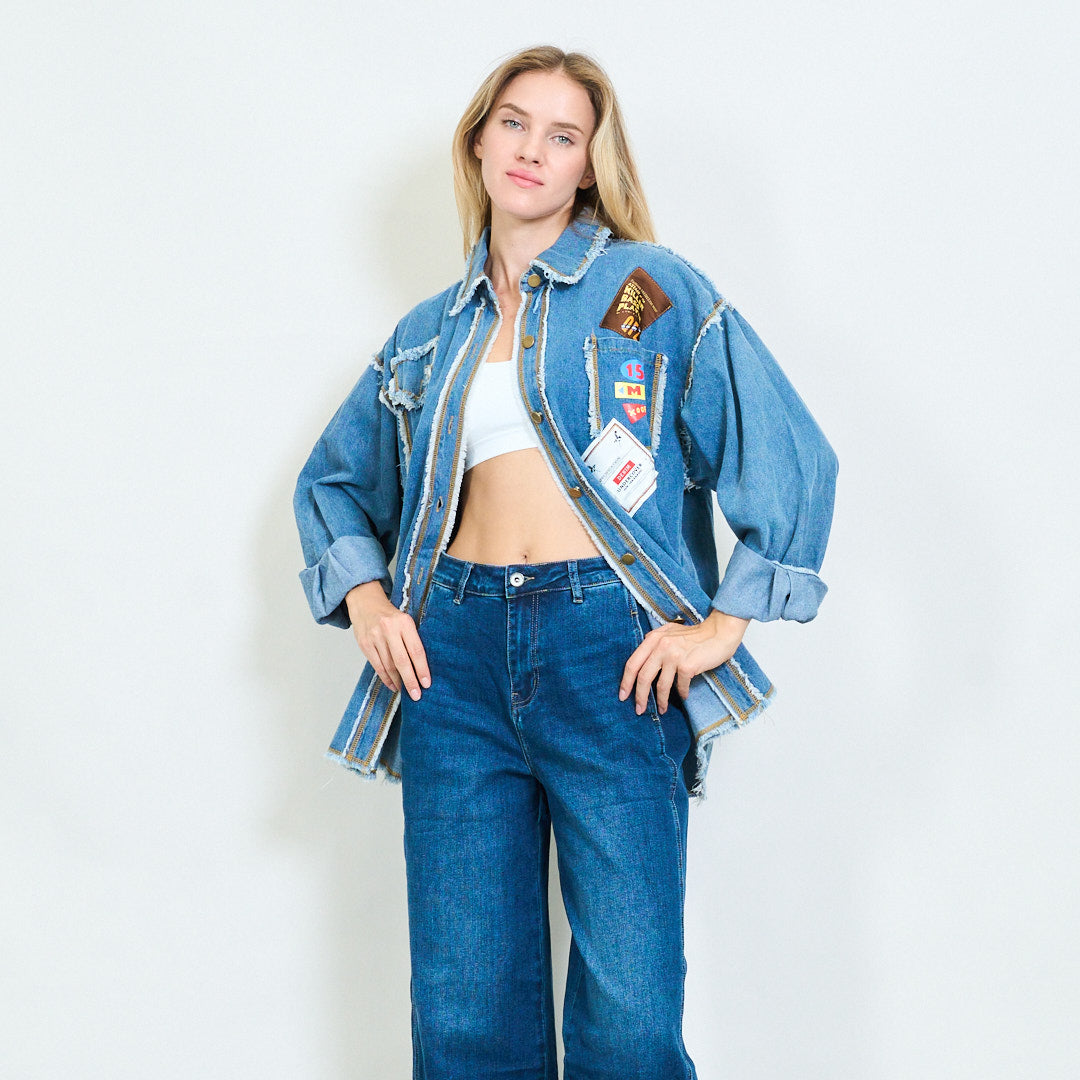 - 牛仔衬衫夹克,带有磨损的原始饰边,可在衣领,羽毛和下摆上