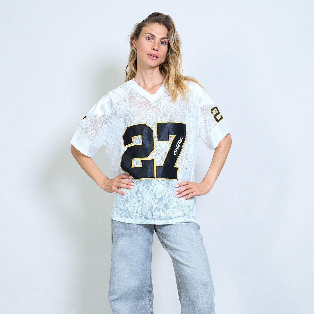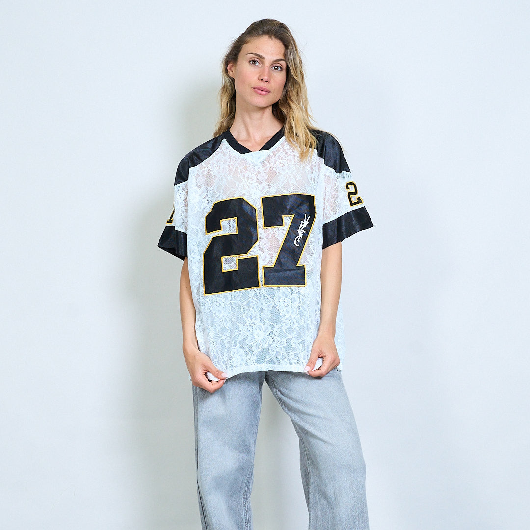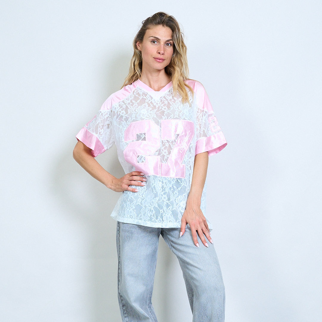 蕾丝叠加层大学“ 27”补丁T恤,带有缎面袖子细节批发