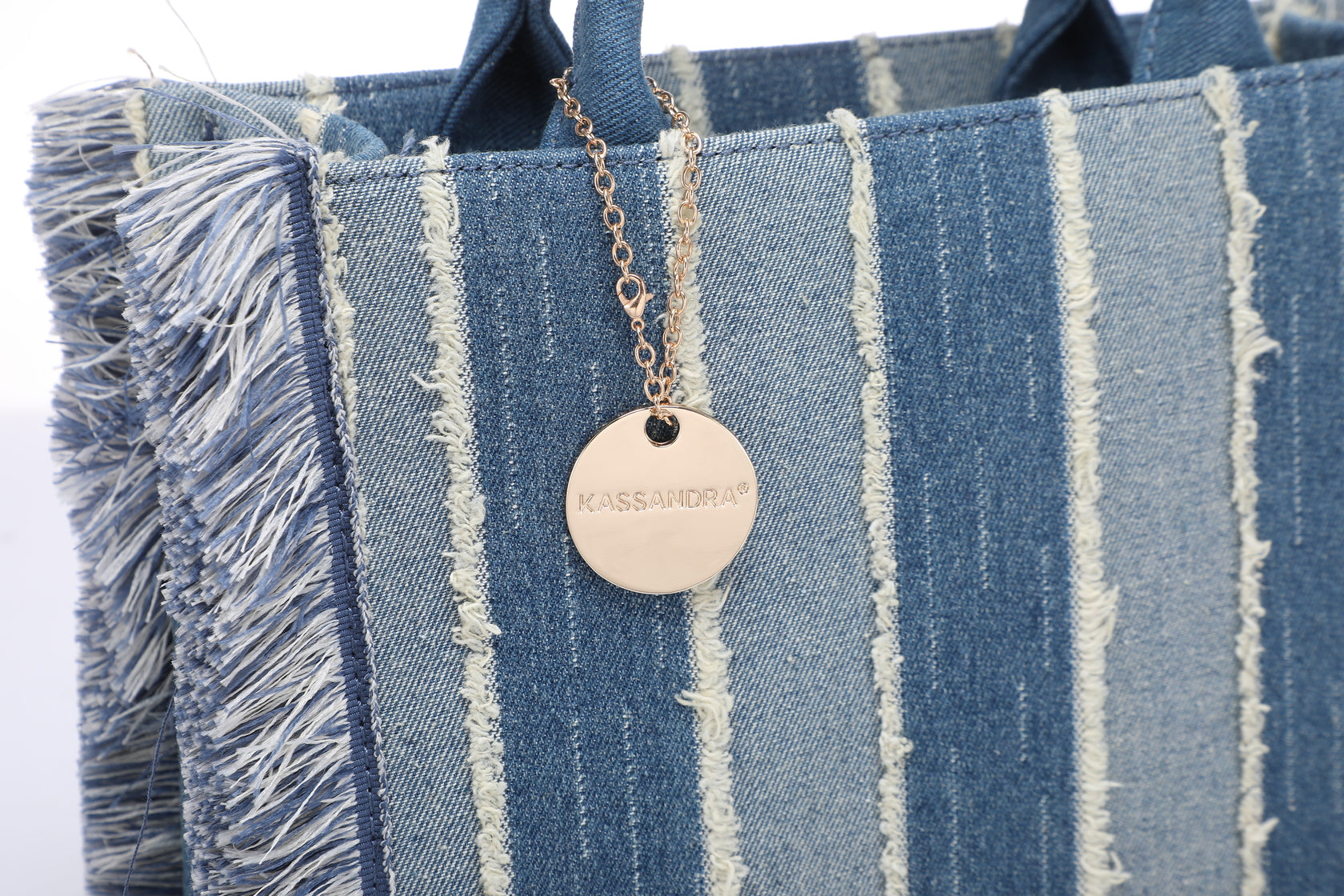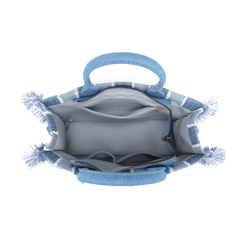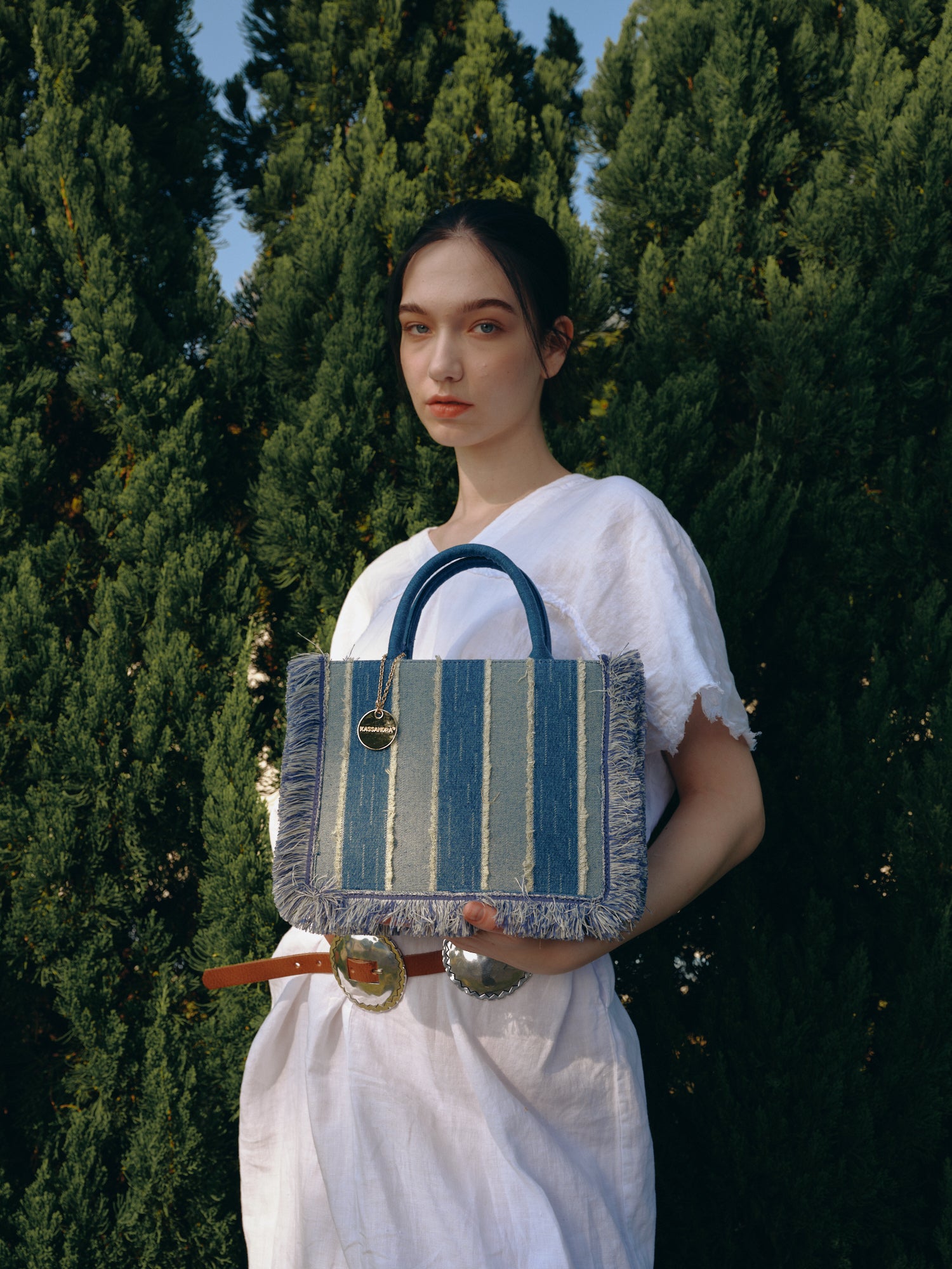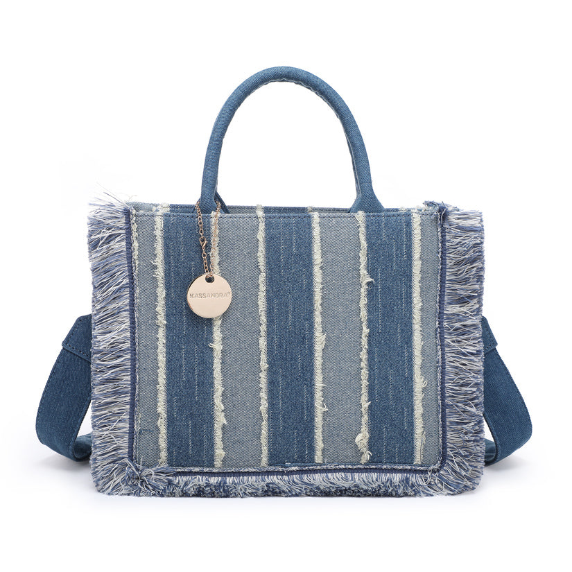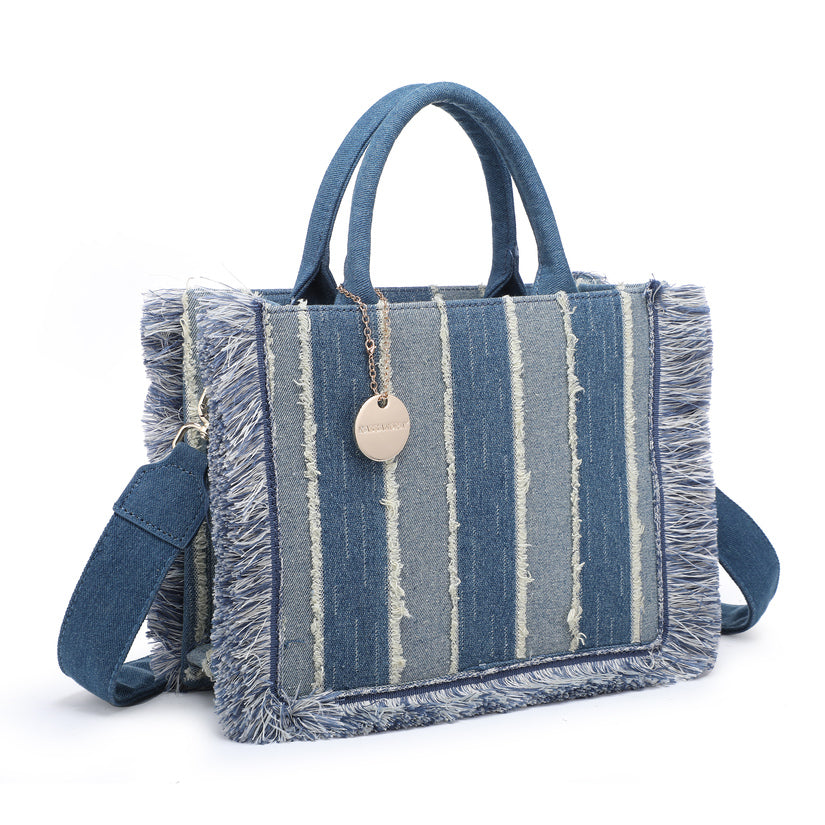 迷你条纹牛仔布手提袋,带有边缘边缘和可拆卸的皮带批发