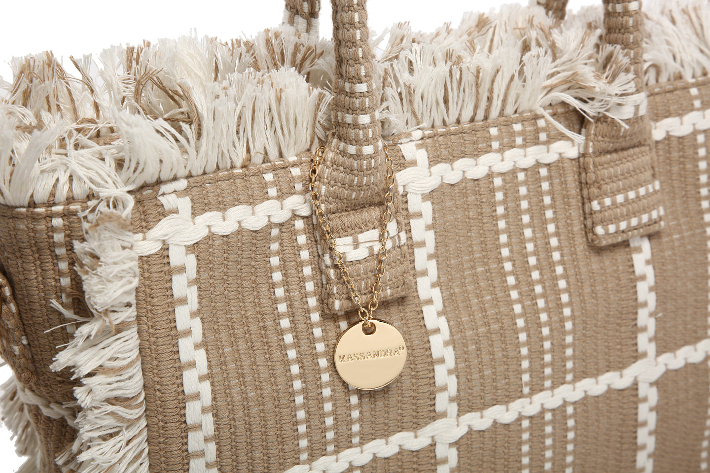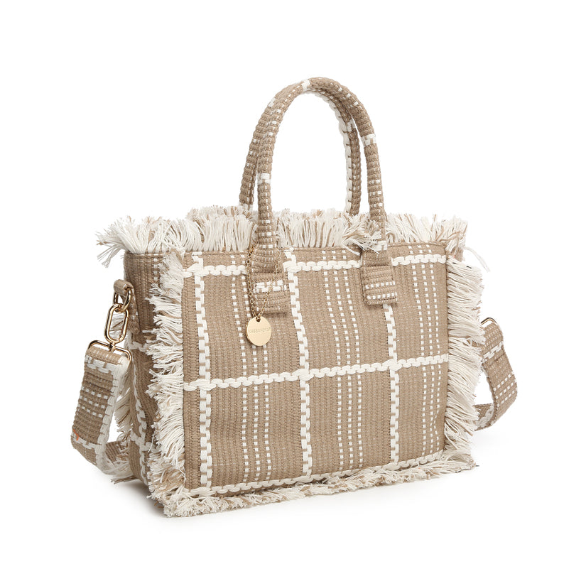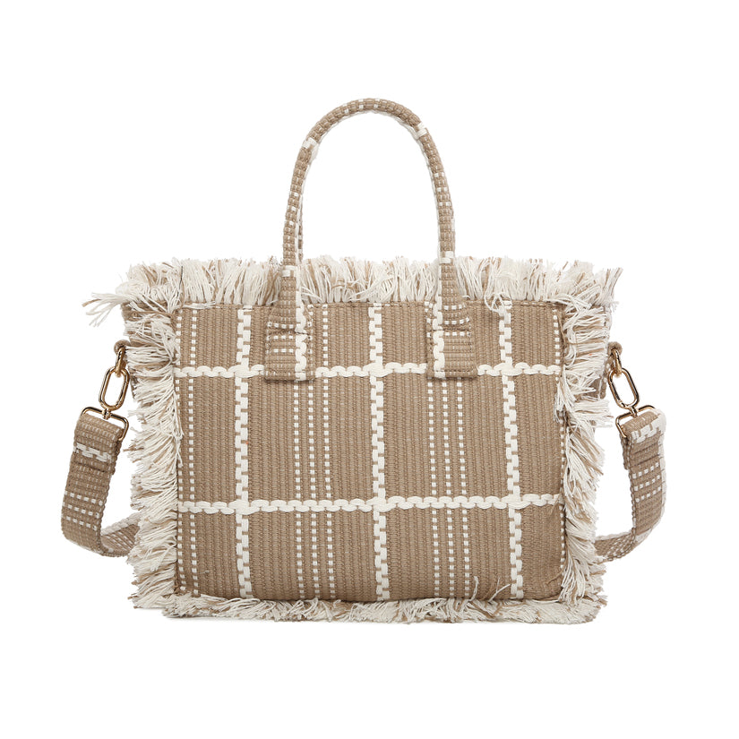 - 极简主义网格图案的编织手提袋,以中性色调易于造型