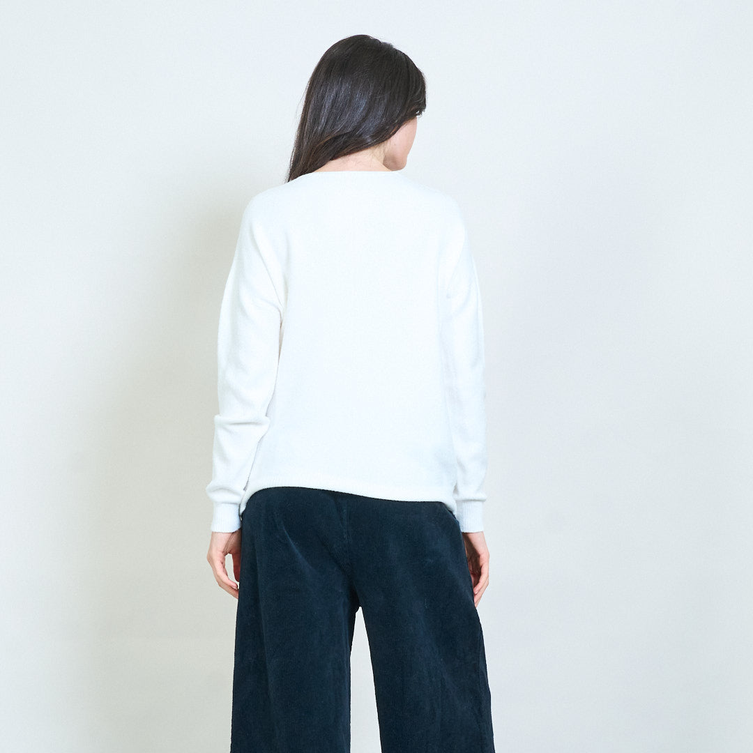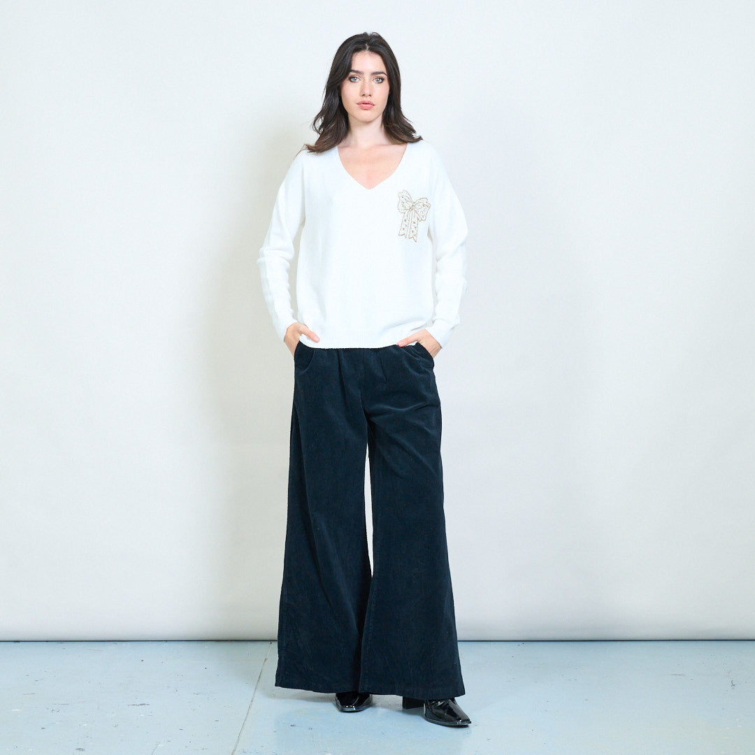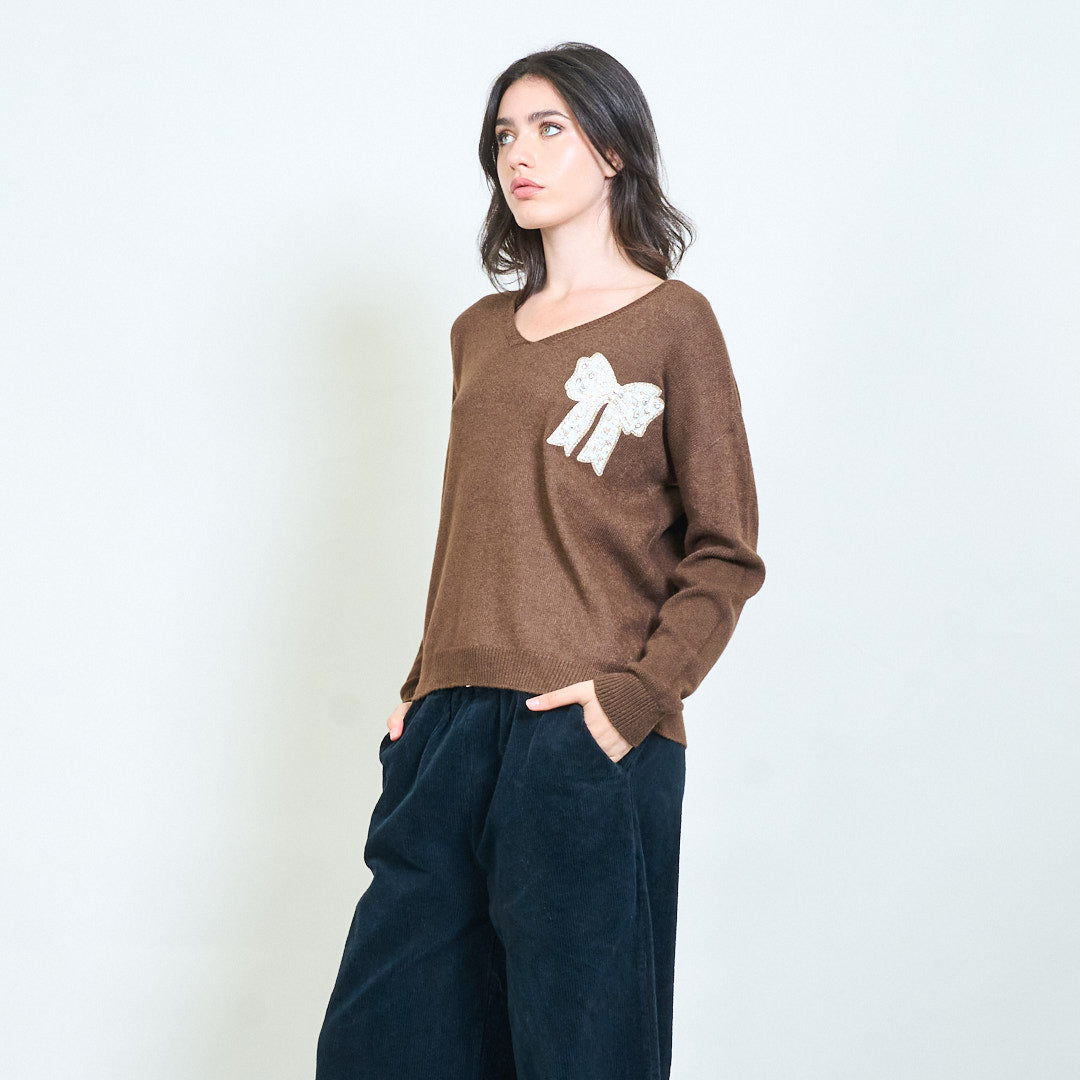 蝴蝶结贴花刺绣V领针织毛衣批发