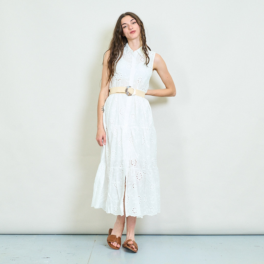 无袖花孔眼刺绣衬衫衣领腰带长裙批发